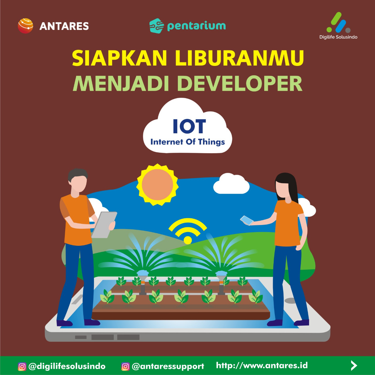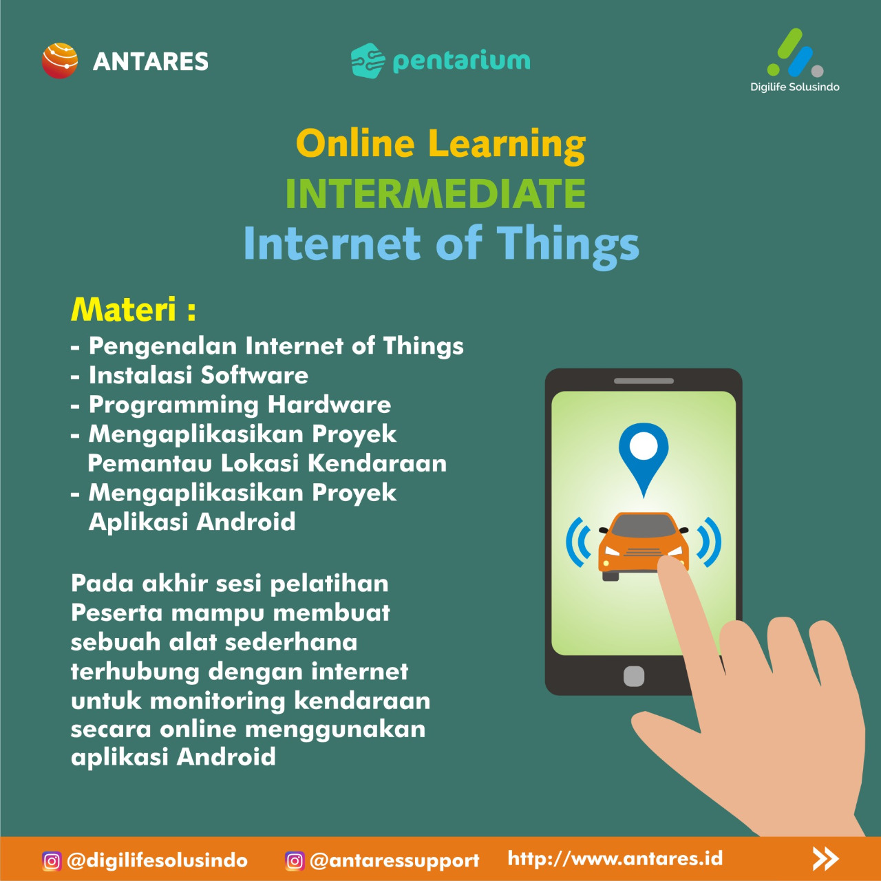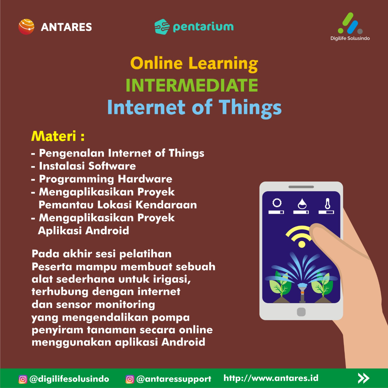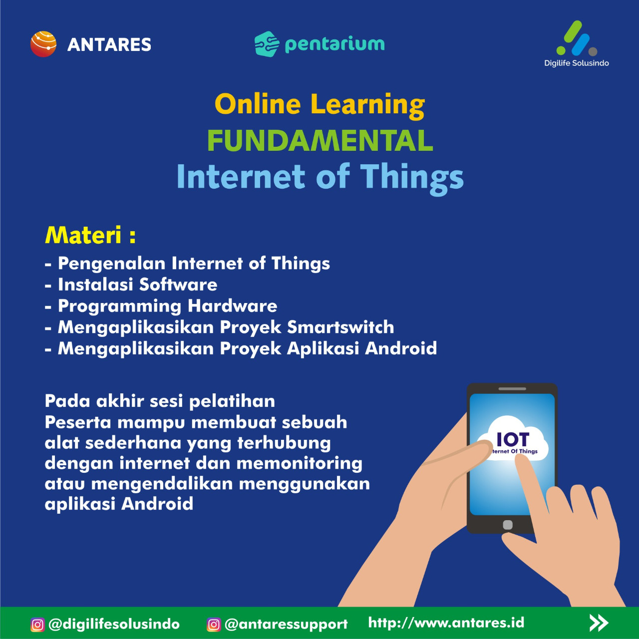 Kamu akan mendapatkan materi tentang IoT dari pengenalan, instalasi, programing, hingga pengaplikasiannya pada Android.
